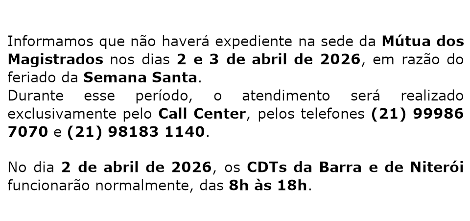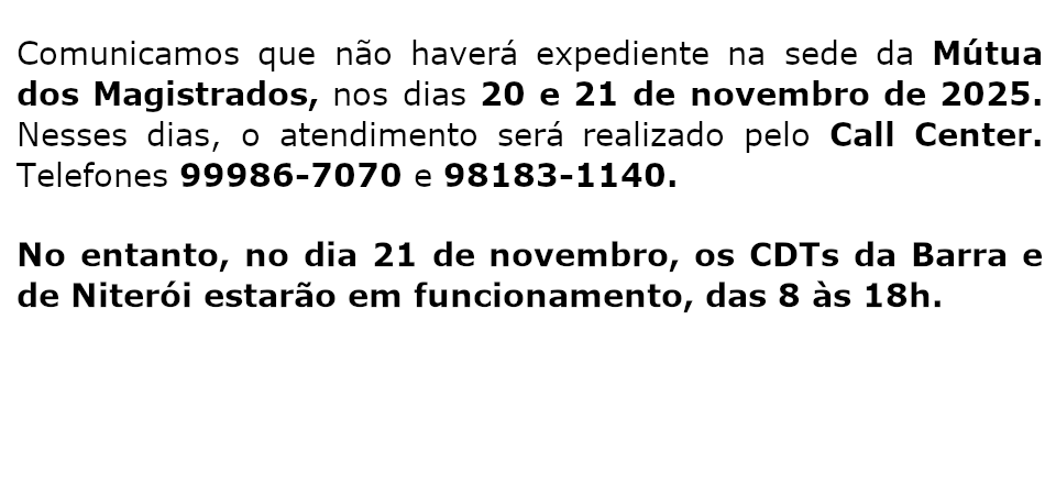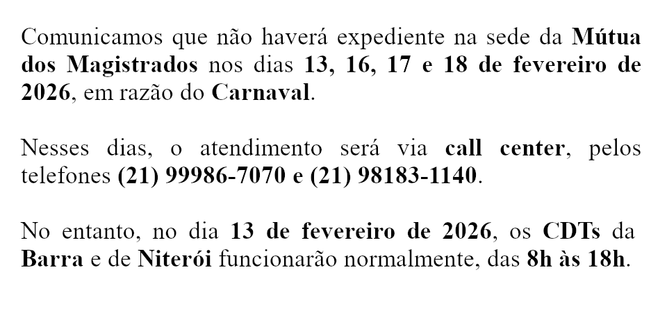 Prezado Associado, Lembramos que, conforme o art. 20 do Regulamento Geral de Benefícios da Mútua do Magistrados do Estado do Rio de Janeiro, o prazo para…